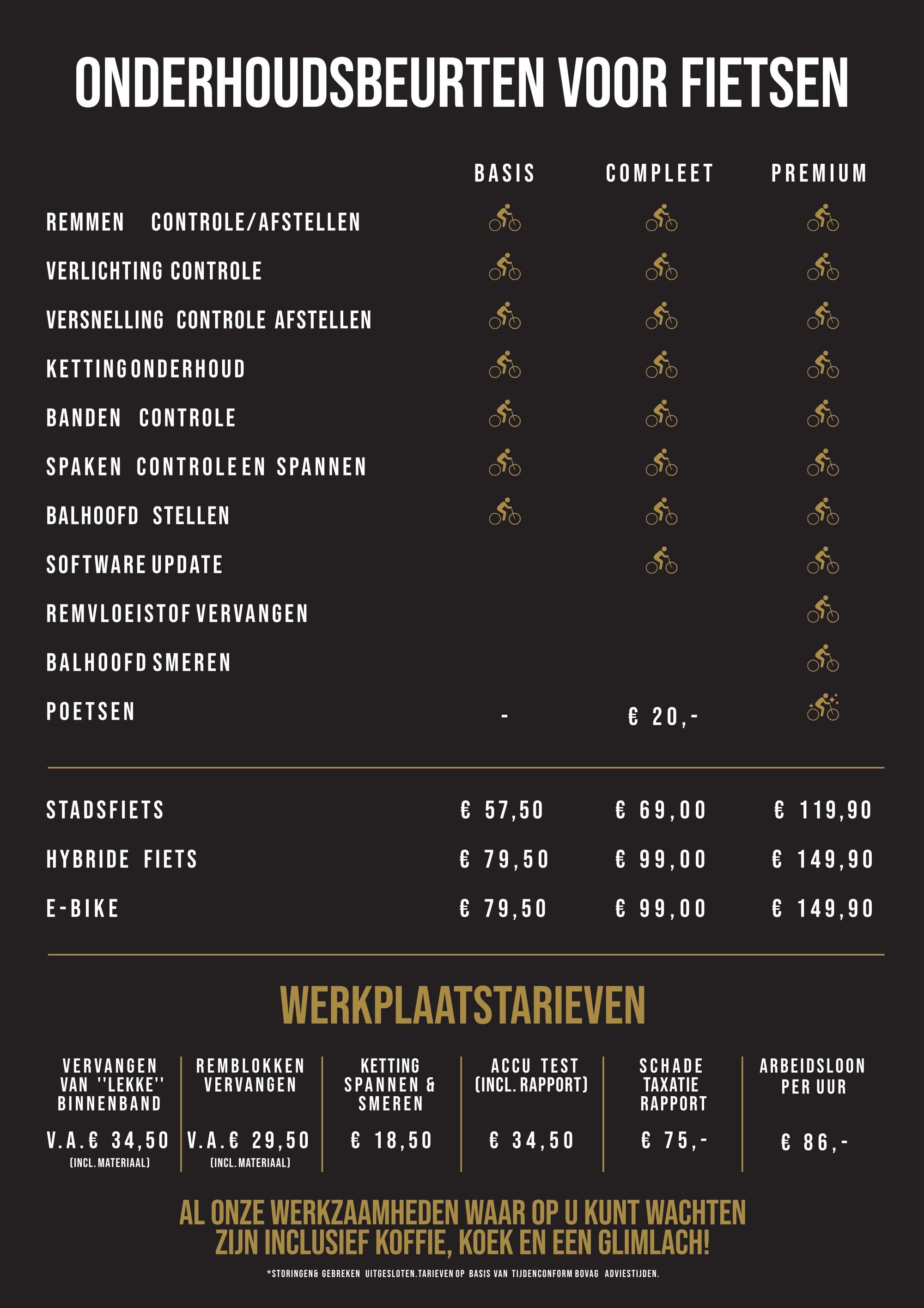 Voor e-bikes rekenen we soms een kleine toeslag bij onderhoud, omdat we extra tijd nemen voor het controleren van de software, accu en motor. Uiteraard bespreken we dit altijd vooraf, zodat je precies weet waar je aan toe bent.